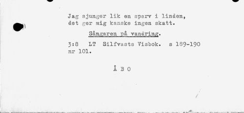 //// Jag sjunger lik en sparv i linden, //// det ger naig kanske ingen skatt. //// Sångaren på vandring. //// 3:8 LT Silfvasts Visbok. s 189-190 //// nr 101. //// ! //// i //// ÅBO //// v //// ML' .. ... „ L^. L- .. ....... .. ............. . ' ^ . ^ ^ , ^ ' ////