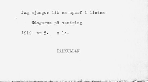 //// Jag sjunger lik en sparf i linden //// * //// Sångaren på vandring //// 1912 nr 5. s 14. //// DALKULLAN ////