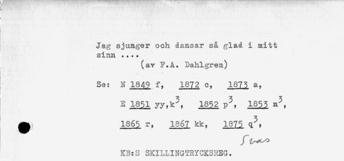 //// ' . //// Jag sjunger och dansar så glad i mitt //// sinn .... //// (av F.A. Dahlgren) //// ; ^ . - //// Se: N 1849 f, 1872 c, 1875 a, //// E 1851 yy,k^, 1852 A 1853 n^, //// KB:S SKILLINGTRYCKSREG. ////