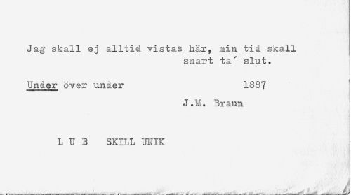 //// Jag skall ej alltid vistas hår, min tid skall //// snart ta' slut. //// Under över under 1887 //// J.M. Braun //// L U B SKILL UNIK //// ...........i . f -^ ;^ , . L, ^ ..^ ^ ////