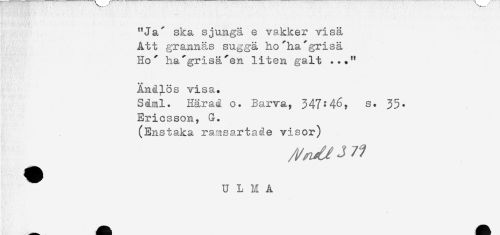 //// "Ja/ ska sjunga e vakker visä //// Att grannäs suggä ho^ha^grisä //// Ho' ha^grisä^en liten galt ..." //// Ändlös visa. //// Såml. Härad o. Barva, 347*46, s. 35. //// Ericsson, G. //// (Enstaka ransartade visor) //// ^ u L n A ////