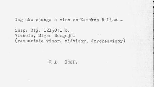 //// Jag ska sjunga e visa om Karsken & Lisa - //// insp. Rtj. 12150:1 b. //// Vidholm, Signe Bergsjö. //// (ramsartade visor, nidvisor, dryckesvisor) //// i //// R A INSP. ////