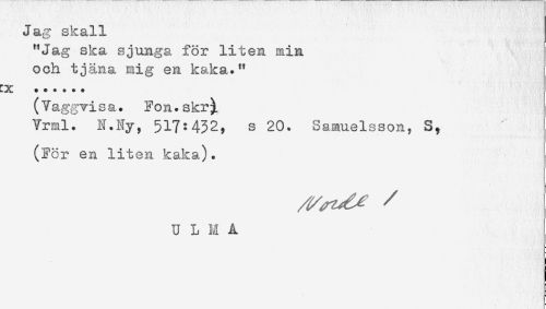 //// Jag skall //// "Jag ska sjunga för liten min //// och tjäna mig en kaka." //// ****** //// (Vaggvisa. Fon.skr). //// Vrml. N.Ny, 517:432, s 20. Samuelsson, S, //// (För en liten kaka). //// U L M A ////