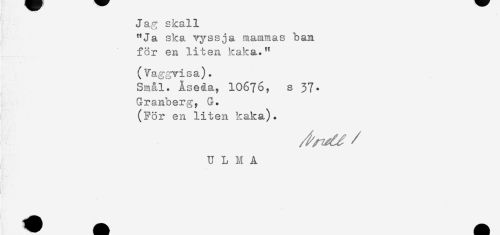 //// Jag skall //// "Ja ska vyssja mammas b an //// för en liten kaka." //// (Vaggvisa). //// Smal. Åse&a, IO676, s 37. //// Granberg, G. //// (För en liten kaka). //// / //// U L M A //// - //// t ////