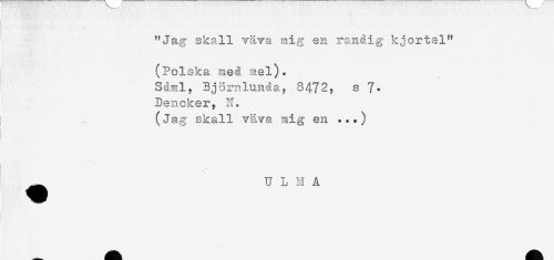 //// "Jag skall väva mig en randig kjortel" //// (Polska meå mel). //// Sdml. Björnlunga, 8472, s 7- //// Dencker, N. //// (Jag skall väva mig en ...) //// ^ U L M A ////