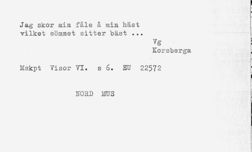 //// Jag skor min fåle å min häst //// vilket söramet sitter "bäst ... //// vg ! //// Korsberga , //// Mskpt Visor VI. s 6. EU 22572 //// i //// NORD MUS ////