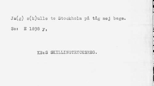 //// s(k)ulle te Stockholm på tåg mej bege. //// Se: E 18$8 y, S //// '- ,'S //// EB:S SKILLINGTRYCKSREG. ' ////