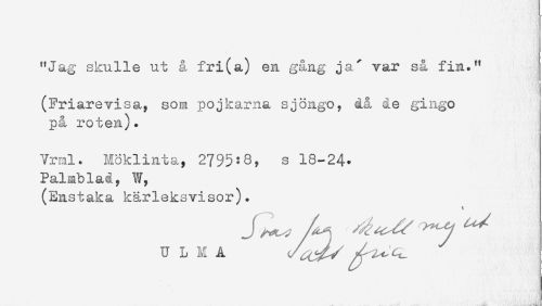 //// "Jag skulle ut å fri (a) en gång ja' var så fin." //// (Friarevisa, som pojkarna sjöngo, då de gingo //// på roten). //// Vrmlt Möklinta, 2795:8, s 18-24. //// Palmblad, W, //// (Enstaka kärleksvisor). //// U L M A ^^^ ^^^ ////
