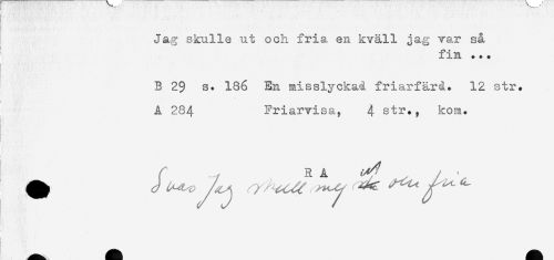 //// Jag skulle ut och fria en kväll jag var så //// fin ..* //// B 2$ s. 186 En misslyckad friarfärå. 12 str. //// A 284 Friarvisa, 4 str., kom. //// ! //// i ////