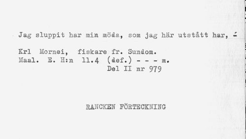 //// Jag sluppit har min möåa, som jag här utst&tt har, - //// Krl Momei, fiskare fr. Sundom. //// Na al. E. H:n 11.4 (åef.) - - - m. //// Del II nr 979 //// RANCKEN FÖRTECKNING ////