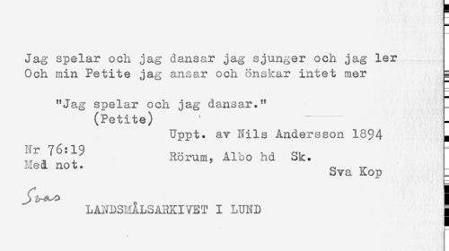 //// Jag spelar och jag dansar jag sjunger och jag ler //// Och min Petite jag ansar och önskar intet mer g //// "Jag spelar och jag dansar." //// (Petite) ' --- //// Uppt. av Nils Andersson 1894 a //// Rörum, Albo hd Sk. //// Med not. ^ //// Sva Kop //// 3 ! //// LANDSNALSARKIVET I LUND j ////