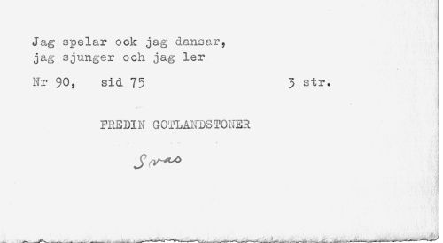 //// Jag spelar ock jag dansar, //// jag sjunger och jag ler //// Nr 90, sid 75 3 str. //// FREDIN GOTLANDSTONER ////