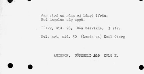 //// Jag stod en gång ej långt ifrån, //// Med ängslan såg uppå. //// 11:22, sid. 26, Den besvikne, 3 str. //// Mel. not, sid. 30 (Lunda sn) Emil Öberg //// ANINSON, SÖDERMLD ^LD KULT H. //// - *< s ////