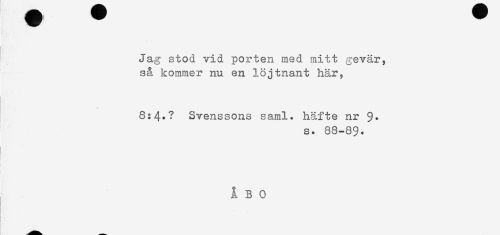 //// Jag stod vid porten med mitt gevär, //// så kommer nu en löjtnant här, //// 8:4.? Svenssons saml. häfte nr 9* //// s. 88-89. ////