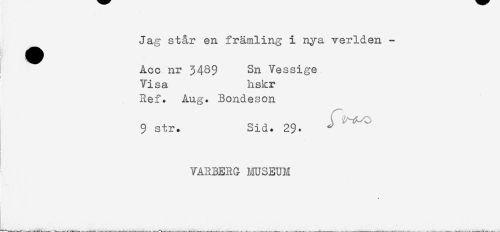 //// Jag st&r en främling i nya verlden - //// Acc nr 3439 Sn Vessige //// Visa hskr //// Ref. Aug. Bondeson //// (^-tjL/O //// 9 str. Sid. 29. ^ //// VARBERG MUSEUM //// % ////