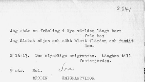//// Jag står en främling i Nya världen långt bort //// från hem //// Jag älskat nöjen och sökt blott flärden och funnit //// dem. //// S 16-17* Den olycklige emigranten. Längtan till //// fosterjorden. //// 9 str. Mel. J^^ //// BRODIN EMIGRANTVISOR ////