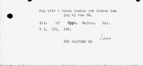 //// Jag sta,r i tusen tankar och älskar den //// jag ej kan få, //// 4:2. LF Ugpt. Wefvar. Mel. //// R 165, 186. //// ÅBO RANCKEN MS ////