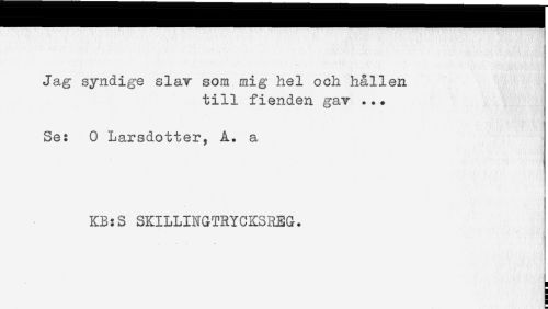 //// Jag syndige slav som mig hel och hållen //// till fienden gav ... //// Se: 0 Larsdotter, A. a //// KB:S SKILLINGTRYCKSREG. ////