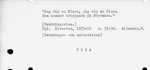 //// "Jag såg en Klara, jag såg en Klara //// Som kommer trippande på Nörrebro." //// (Bevåringsvisa.) //// Ögl. Älvestad, 1973:15 s. 35-36. Åldenius,H. //// (Bevärings- och soldatvisor) //// ! //// ^ U L H A ////