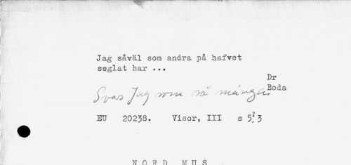 //// ,' . ... . : ' ' < Y ' ' ' ' - ' . \ < - ., * ^ / ' . '. . . //// i'. -- ' - ''' ' ' - - ' .'' //// < //// Jag såväl som andra på hafvet //// seglat har ... //// Dr //// ^ Boda //// EU 20238. Visor, III s 5?3 //// N n P B M II S ////