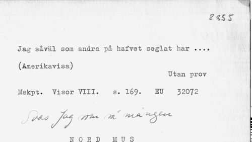 //// Jag såväl som andra på hafvet seglat har .... //// (Amerikavisa) //// Utan prov //// Mskpt. Visor VIII. s. 169* EU 32072 //// ... ^ //// E 0 R D M U S : ////