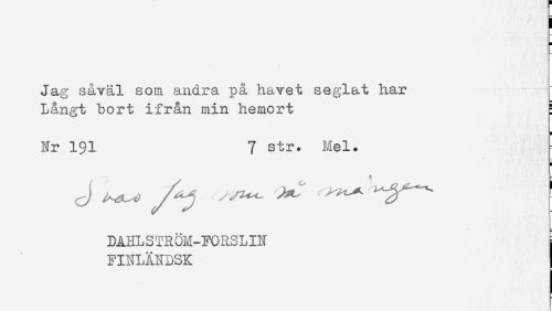 //// i //// H //// Jag såväl som andra på havet seglat har //// Långt bort ifrån min hemort ! //// Nr 191 7 str. Hel. //// ä //// J ^ ^ ^ //// DAHLSTRÖM-FORSLIN j //// FINLÄNDSK ////