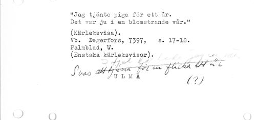 //// "Jag tjänte piga för ett år. //// Det var ju i en blomstrande vår." //// (Kärleksvisa). //// Vb. Degerfors, 7397, s. 17-18. //// Palmblad, W. //// (Enstaka kärleksvisor). //// i ^ o o ////