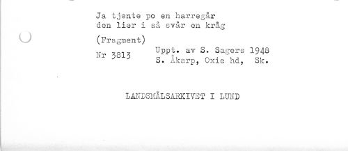 //// Ja tjente po en harregår //// den lier i så svår en kråg //// (Fragment) //// N- ^SH ^ ^^ers 1948 //// ^ ^ S. Akarp, Oxie hd, Sk. //// LANDS^IÅLSARKIVET I LUI-ID ////