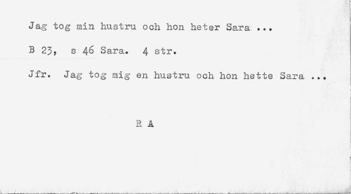 //// Jag tog min hustru och hon heter Sara ... //// B 23? s 46 Sara. 4 str. //// Jfr. Jag tog mig en hustru och hon hette Sara ... //// R Å //// ' ' ' . ' , .d ////