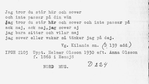 //// Jag tror du. står här och sover //// och inte passar på din vän //// gag tror du står hår och sover och inte passar på //// ack nej, ack nej,jag sover ej //// jag bara sitter och vilar mej //// jag sover eller vakar så tänker jag på dej. //// Vg. Kilanda sn. ^D 139 add) //// IFGH 2103 UpDt. Helmer Olsson 1930 eft. Anna Olsson //// f. 1868 i Hemsjö //// NORD MUS. ^ 4 % y //// T ////