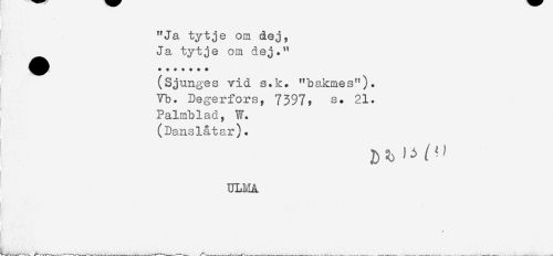//// "Ja tytje om dej, //// Ja tytje om dej." //// T)]]]]!' + * + + + + //// (Sjunges vid s.k. "bakmes"). //// Vb. Degerfors, 7397, s. 21. //// Palmblad, W. //// (Danslåtar). //// ! //// ULMA. ////