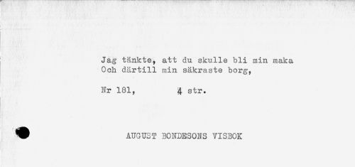 //// Jag tänkte, att du skulle bli min maka //// Och därtill min säkraste borg. //// Nr 181, 4 str. //// ^ AUGUST BONDESONS VISBOK ////
