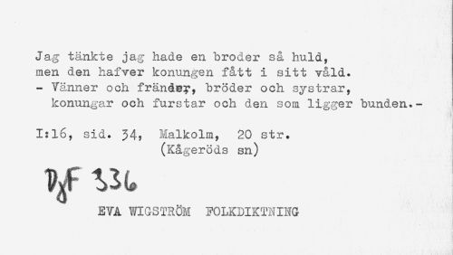 //// Jag tänkte jag hade en broder så huld, //// men den hafver konungen fått i sitt våld. //// - Tänner och fränåey, bröder och systrar, //// konungar och furstar och den som ligger bunden.- //// 1:16, sid. 34? Malkolm, 20 str. //// (Kågeröds sn) //// Vgf //// EVA Vm-STRÖM FOLKDIKTNING ////