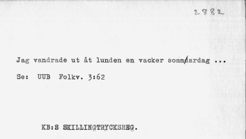 //// t. //// Jag vandrade ut &t lunden en vacker somm^ardag ... //// Se: UUB Folkv. 3:62 //// KB:S SKILLINGTRYCKSREG. ////