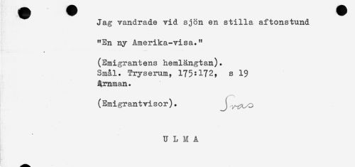 //// Jag vandrade vid sjon en stilla aftonstund //// "En ny Amerika-visa." //// * //// (Emigrantens hemlängtan). //// Smål. Tryserum? 175:172, s 19 //// ^rnman. //// * * //// (Emigrantvisor). Jy^o //// U L M A ////