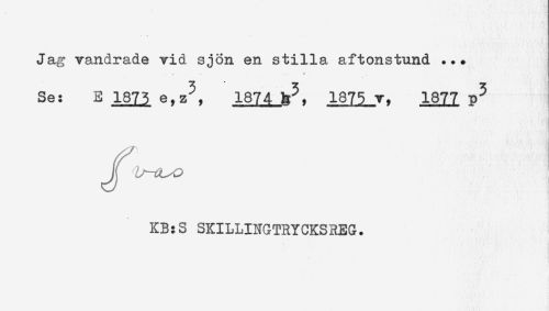 //// Jag vandrade vid sjön en stilla aftonstund ... //// r ' * //// Se: E 1875 e.z^. 1874 1875 v, 1877 //// 1 //// KB:S SKILLINGTRYCKSREG. ////