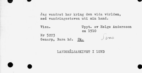//// Jag vandrat har kring den vida världen, //// med vandringsstaven uti min hand. //// Visa. Uppt. av Helge Andersson //// ca"1910 //// Nr 5223 T //// Genarp, Bara hd. Sk. //// LANDSHÅLSARKIVET I LUND //// . ** . ////