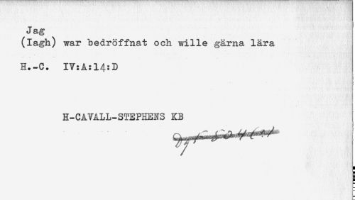 //// Jag //// (lagh) war bedroffnat och wille gärna lära //// H.-C. IV:A:14:D //// H-CAVALL-STEPEENS KB //// H //// H //// 5 //// s ////