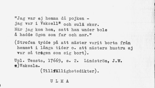 //// "Jag var ej hemma då pojken - //// jag var i Vaksell^ och sula skor. //// När jag kom hem, satt han under bole //// å hadde ogon som far och mor." //// (Strofen tydde på att mäster varit borta från //// hemmet i långa tider o. att masters hustru ej //// var så trogen som sig bort). //// Upl. Tensta, 1?669, s. 2. Lindström, J.W. //// Vaksala. //// (Tillfällighetsdikter). //// U L M A //// t , ////