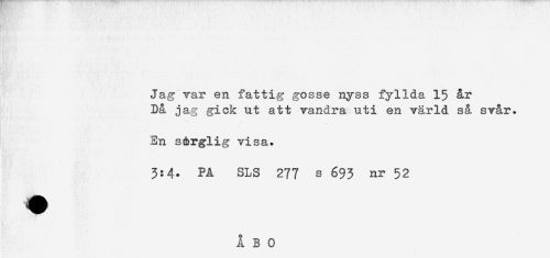 //// Jag var en fattig gosse nyss fyllda 15 år //// Då jag gick ut att vandra uti en värld så svår. //// En sérglig visa. //// 3:4- PA SLS 277 s 693 nr 52 ////