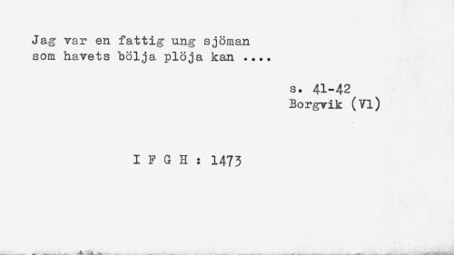 //// Jag var en fattig ung sjöman //// som havets bölja plöja kan .... //// s. 41-42 //// Borgvik (Vi) //// I F G H : 1473 ////