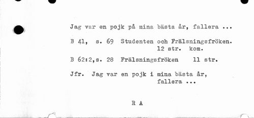 //// •Jag var en pojk på mina bästa år, fallera ... //// ) //// B 419 69 Studenten och Frälsningsfröken» //// 12 str. kom. //// B 62:2,s. 28 Frälsningsfröken 11 str. //// Jfr. Jag var en pojk i mina hasta år, //// fallera ... //// B Å //// _I___IL..._...1___r\.. ////