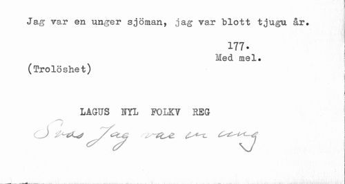 //// Ja g Tar en unger sjöman, ja g var blott tjugu år. //// 177. //// Med mel. ! //// (Trolöshet) //// LAGUS FIL FOLK? REG ////