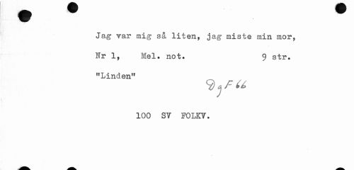 //// Jag var mig så liten, jag miste min mor, Hr 1, Mel* not. 9 str. //// "Linden11 //// 100 SY FOLKV. //// t ////