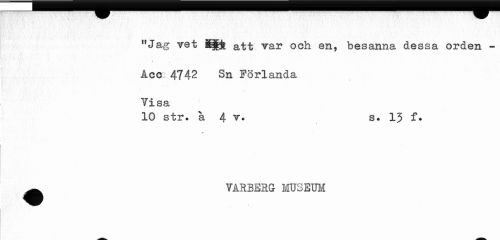 //// "Jag vet §f£ att Tar och en, besanna dessa orden - //// j //// Åcc 4742 Sn Förlanda Visa //// 10 str. a 4 t. s. 13 f. //// ^ YARBERG MUSEUM ////
