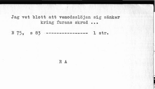 //// » //// Jag Tet blott att vemodsslöjan sig sänker //// kring furans skrud ..• //// B 75, s 83 --- 1 str» //// H A //// i ////