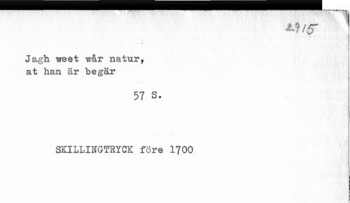 //// 11 ¦ ... //// i //// ¦a ' ¦ • //// i . * //// Jagh weet wår natur, at han är begär //// 57 S. //// SKILLIMGTRYCK före 1700 ////