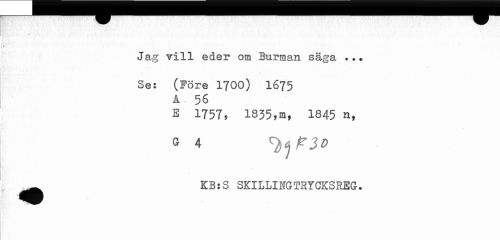//// r //// Jag vill eder om Burman säga ... //// Se: (Före 1700) I675 Å 56 //// E 1757, 1835,m, 1845-a, G 4 //// * ////