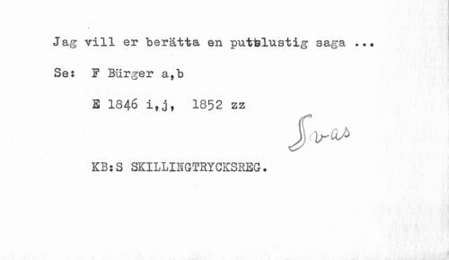 //// Jag vill er berätta en putslustig saga ... Se: F Burger a,b //// E 1846 i,j, 1852 zz //// \oo~QJ> //// KB:S SKILLIHGTRYCKSREG-. ////