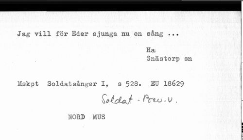 //// Jag vill för Eder sjunga nu en sång //// Ha. //// Snästorp sn Mskpt Soldatsånger I, s 528. EU 18629 //// HORD MUS //// ! //// i //// i ////